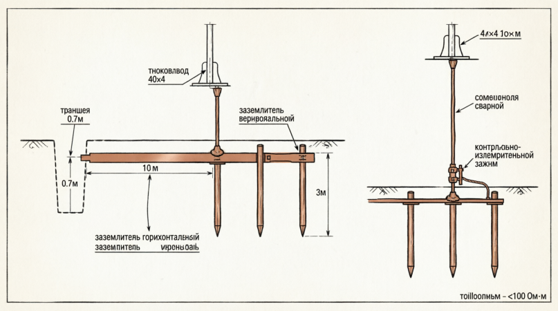- Горизонтальный заземлитель (полоса 40×5мм, длина 10м)