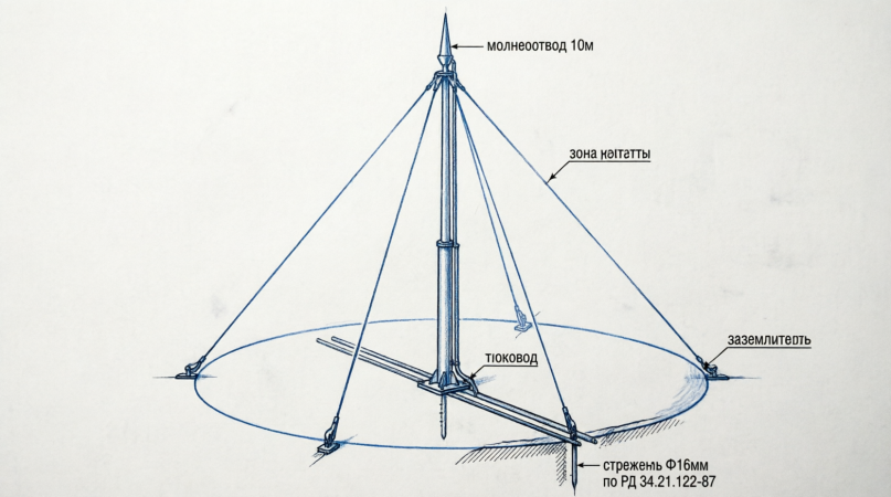 - Зона защиты (конус 45° по РД 34.21.122-87)