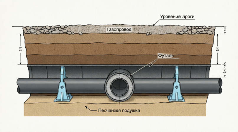 [Сечение А-А] ┌─────────────────────────┐ ← Уровень грунта дороги │ Грунт (восстановленный)│ ├─────────────────────────┤ │ Подушка песчаная 150 мм│ ├─────────────────────────┤ │ ╔═══════════════════╗ │ │ ║ ФУТЛЯР (сталь) ║ │ ← Защитная труба │ ║ ┌─────────────┐ ║ │ │ ║ │ГАЗОПРОВОД │ ║ │ ← Рабочая труба │ ║ │(с изоляцией)│ ║ │ │ ║ └─────────────┘ ║ │ │ ╚═══════════════════╝ │ │ ↑ Центрирующие опоры │ ├─────────────────────────┤ │ Песчаная обсыпка 100 мм│ └─────────────────────────┘